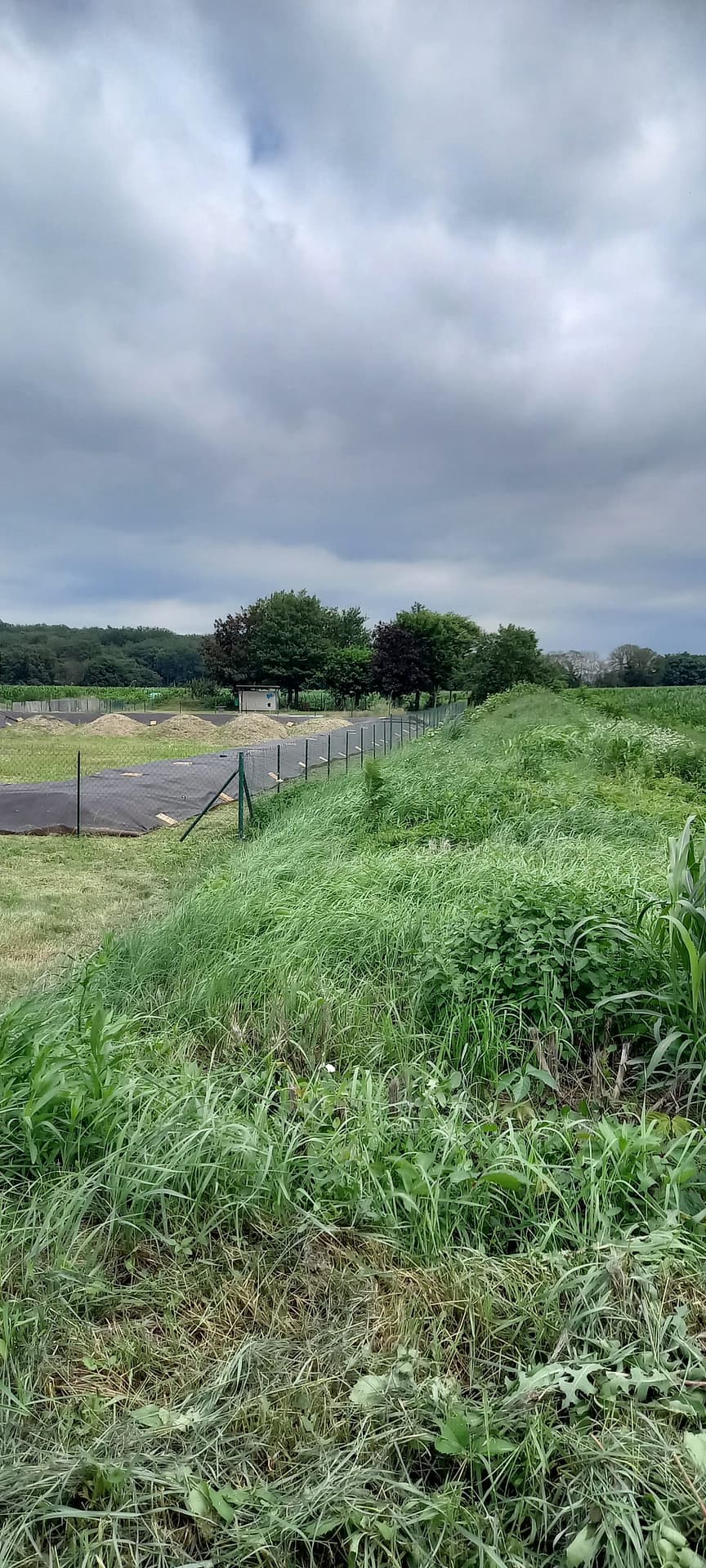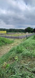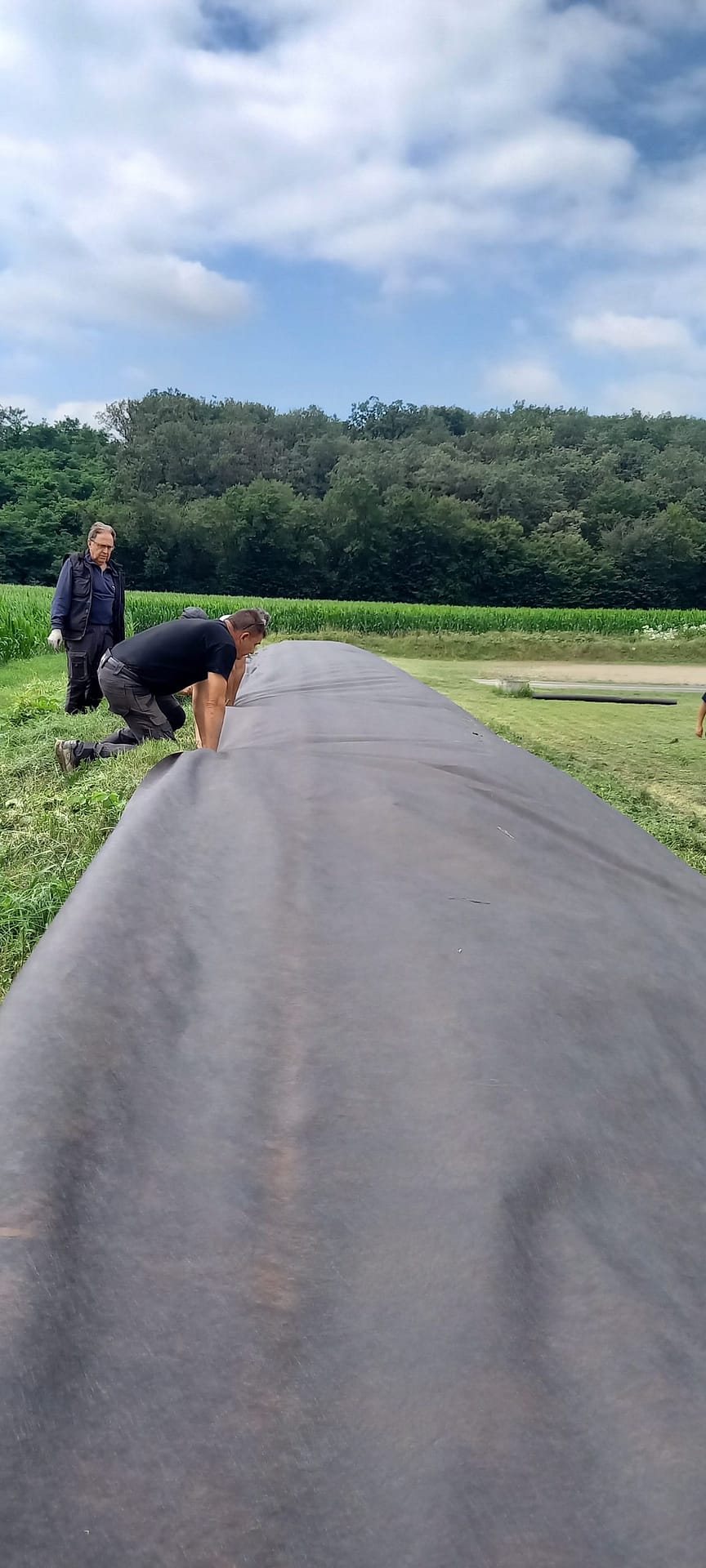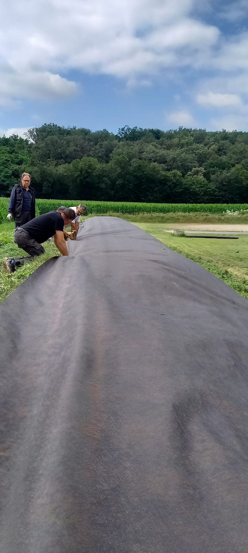 La pose de la bâche autour du nouveau bassin (sur la bute) a mobilisé beaucoup de personnes et d’efforts, le résultat devrait être probant : adieu les mauvaises herbes !