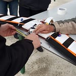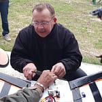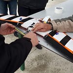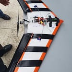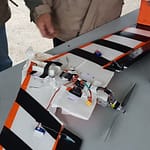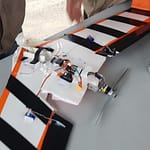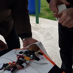 Jean-François l’a fait, et ça a volé malgré ce qu’on pensait ! Mais voilà un (léger) problème de centrage est rapidement apparût. Alors on a fait avec les moyens du bords pour arranger ça tu vois, quelques cailloux par-ci et par là ont fait l’affaire. Et bien sûr, le ruban adhésif assure une fixation certaine de tes cailloux fixés à la hate à l’avant de l’appareil ! 😀